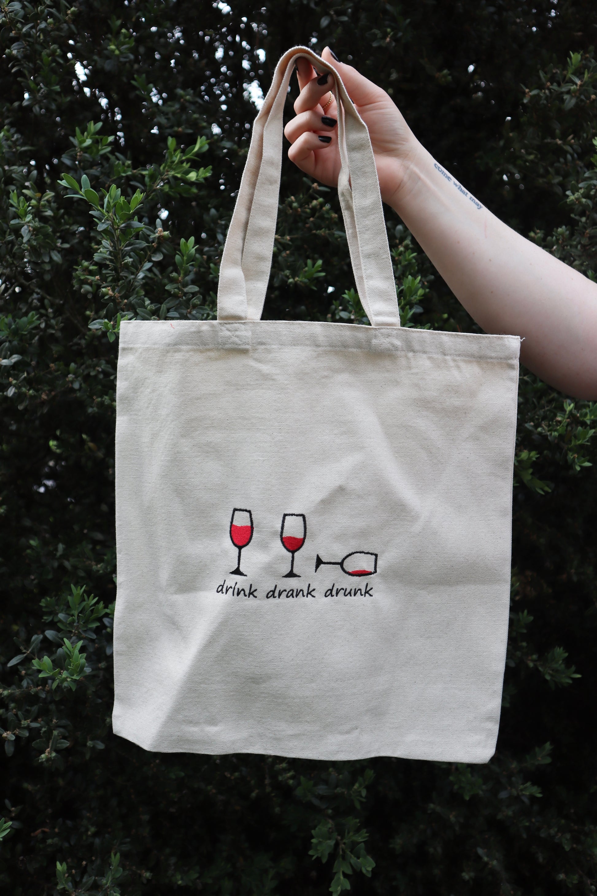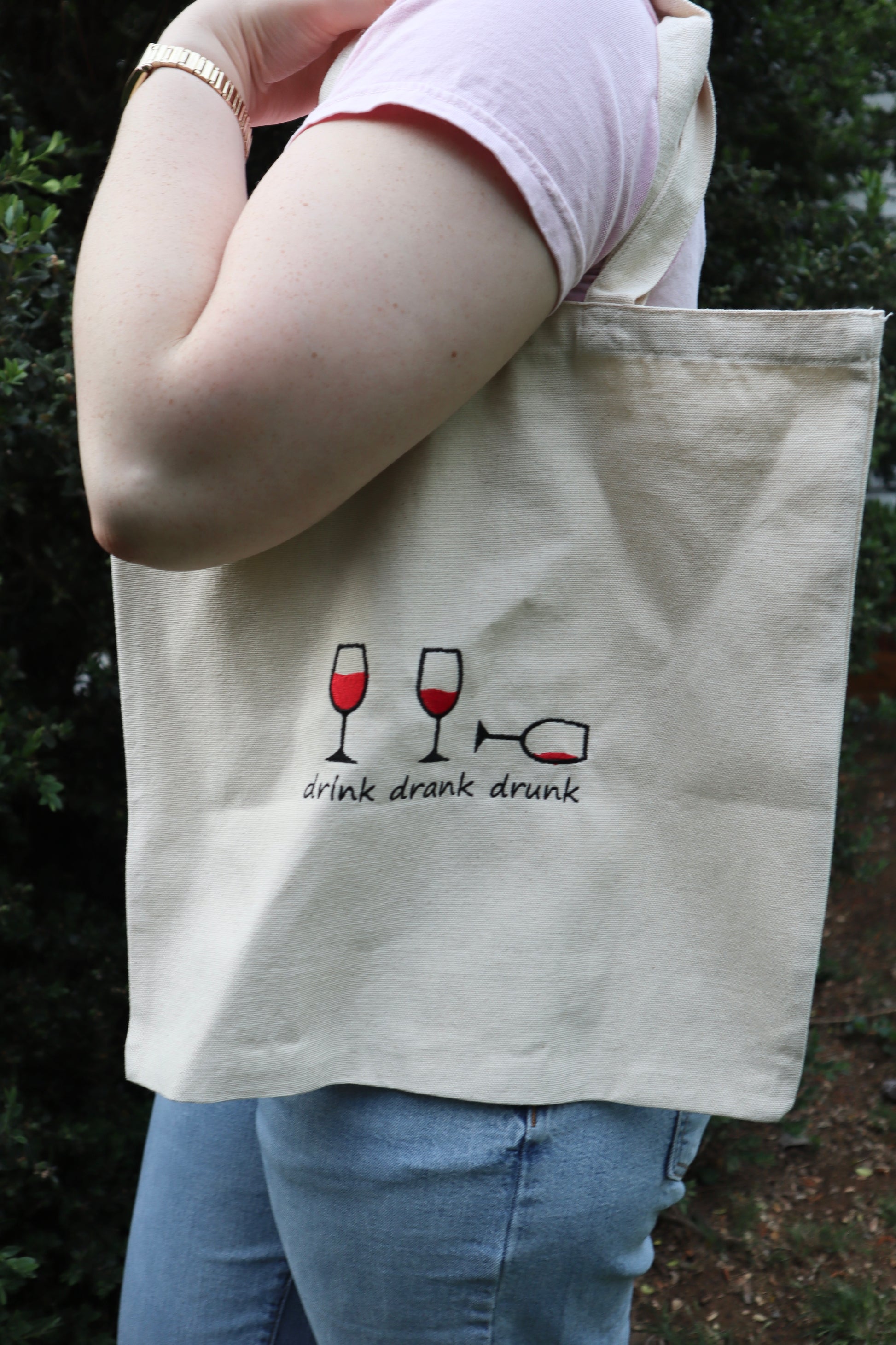 Wine lovers, meet your new favorite tote bag! Our Embroidered "Drink, Drank, Drunk Wine" bag is made from natural canvas and features a playful phrase that only true wine enthusiasts will appreciate. Perfect for wine tastings, picnics, or just carrying your favorite bottle(s) around, this bag is both functional and stylish. Get ready to sip in style, because this bag is a must-have for any wine-lover!